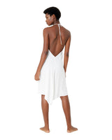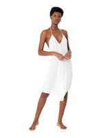 Spaghetti strap V neck dress with tie closure at neck and gold hardware accents.