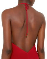 Spaghetti strap V neck dress with tie closure at neck and gold hardware accents.