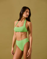 Model's wearing the matching Angela Bottom but make it your own style and pair it with any other black or solid color Bossa Swim bikini bottom.