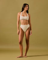 Model's wearing the matching Angela Bottom but make it your own style and pair it with any other black or solid color Bossa Swim bikini bottom.