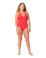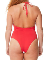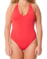 A simple halter one piece with adutable ties at the neck; wear it as high or as low as you want. The hip height and back coverage are the same sigtaure fit as the other Bossa One Pieces; with medium coverage and a higher leg cut.